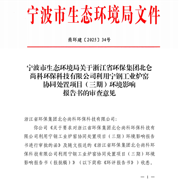 7月29日,尚科环保成功取得《宁波市生态环境局关于浙江省环保集团北仑尚科环保科技有限公司利用钢铁工业炉窑协同处置项目(三期)环境影响报告书的审查意见》(甬环建〔2025〕34号),获准建设资源化利用焚烧后废金属10000吨/年。