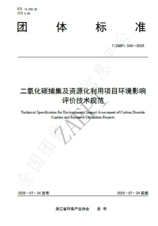 2025年7月24日,由浙江省环保集团生态环保研究院牵头制定的《二氧化碳捕集及资源化利用项目环境影响评价技术规范》(T/ZAEPI 045-2025)团体标准正式发布并实施。该标准由浙江省环保产业协会归口管理,联合省内多家环保领域骨干企业共同起草,填补了工业领域二氧化碳捕集及资源化利用项目环评技术规范的空白。